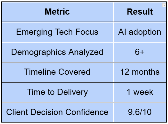 A creative agency was advising a client on whether to incorporate AI features into a new product launch. The challenge: leadership needed more than intuition — they wanted to understand how U.S. consumers perceive AI adoption before making a commitment.