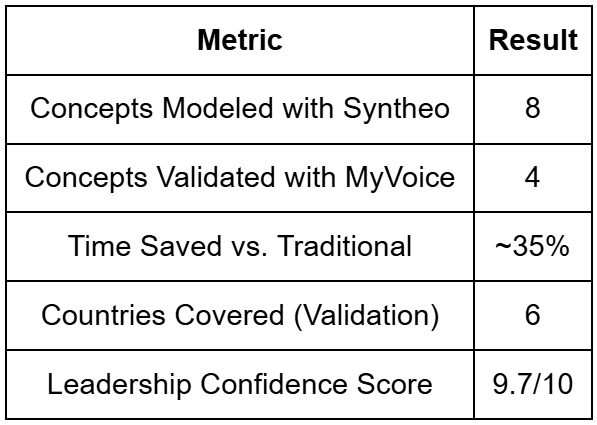 By using Syntheo + Panels, the brand reduced risk, saved time, and ensured only the strongest ideas advanced.